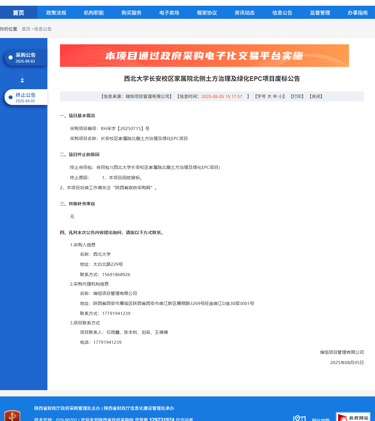 乐动网页版登录入口长安校区家属院北侧土方治理及绿化EPC项目废标公告 作者: 编辑:党丹珩 时间:2025-08-05 公告地址:http://www.ccgp-shaanxi.gov.cn/freecms/site/shaanxi/ggxx/info/2025/8a69c8f99860f21c0198790d379441f5.html?noticeType=001004¬iceId=5c6803f0-71ce-11f0-8063-08c0eb20c666