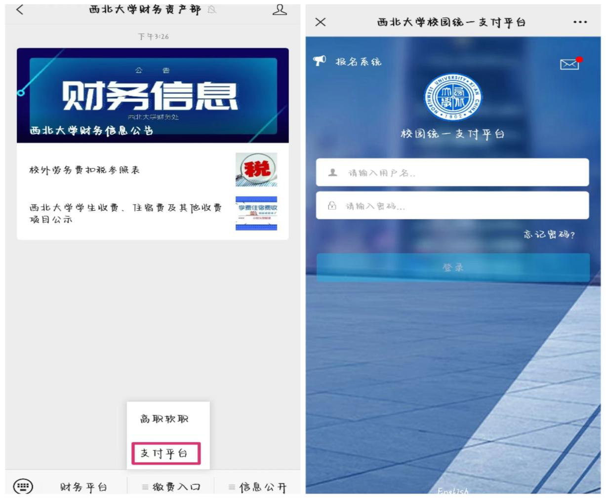 手机端:关注“乐动网页版登录入口财务资产部”微信公众号,选择“缴费入口”点击“支付平台”进入。(见下图)