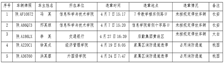 2023年4月份校园交通违章曝光 作者: 编辑: 时间:2023-05-10 为加强校内道路交通管理,规范校内交通秩序,根据《乐动网页版登录入口校园道路交通管理办法》的通知要求,现将2023年4月校园交通违章车辆曝光如下。 希望广大师生员工遵守校园道路交通管理办法,维护校园交通安全,共同营造良好的校园交通秩序。 乐动网页版登录入口道路交通安全委员会 2023年5月10日