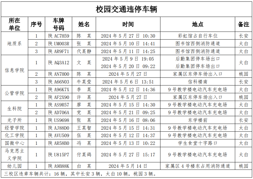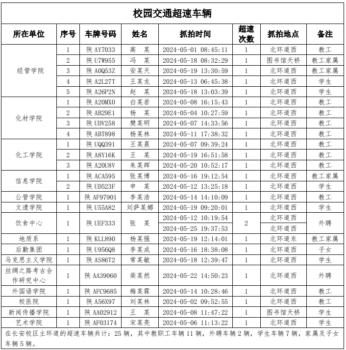 为加强校内道路交通安全管理,规范校内交通秩序,根据《乐动网页版登录入口校园道路交通管理办法》有关要求,现将2024年5月校园交通违章车辆予以曝光,所在单位负责对本单位违章师生员工进行交通安全教育和日常管理,对于校内曝光超速的学生车辆将取消下一年度的通行证办理资格。