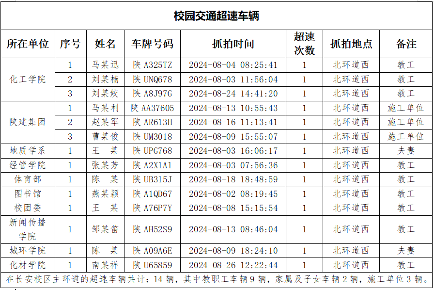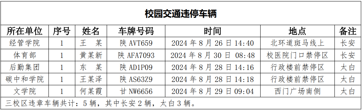 为一步加强校园交通管理,保障校园交通安全有序,维护学校正常的教学、科研和生活秩序以及师生员工的人身财产安全,根据《乐动网页版登录入口校园交通安全管理规定》有关要求, 现将2024年8月校园交通违章车辆予以曝光,具体情况如下表。
