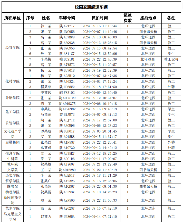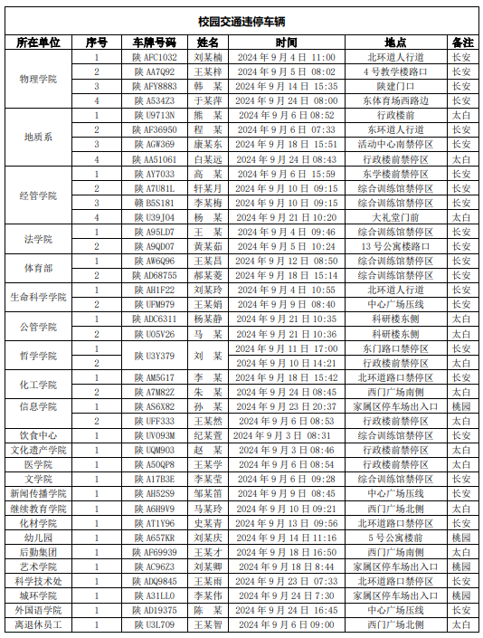 为一步加强校园交通管理,保障校园交通安全有序,维护学校正常的教学、科研和生活秩序以及师生员工的人身财产安全,根据《乐动网页版登录入口校园交通安全管理规定》有关要求, 现将2024年9月校园交通违章车辆予以曝光,具体情况如下表。