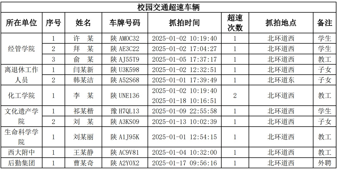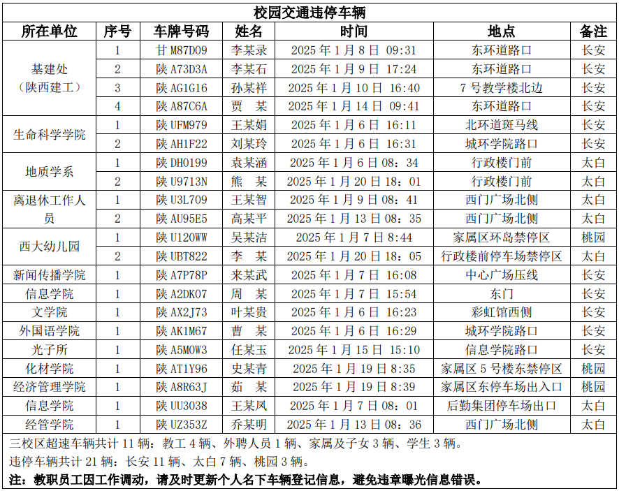为进一步加强校园交通管理,保障校园交通安全有序,维护学校正常的教学、科研和生活秩序,切实保护师生员工的人身财产安全,根据《乐动网页版登录入口校园交通安全管理规定》的相关要求,现将2025年1月校园交通违章车辆予以曝光,具体要求与违章信息如下。