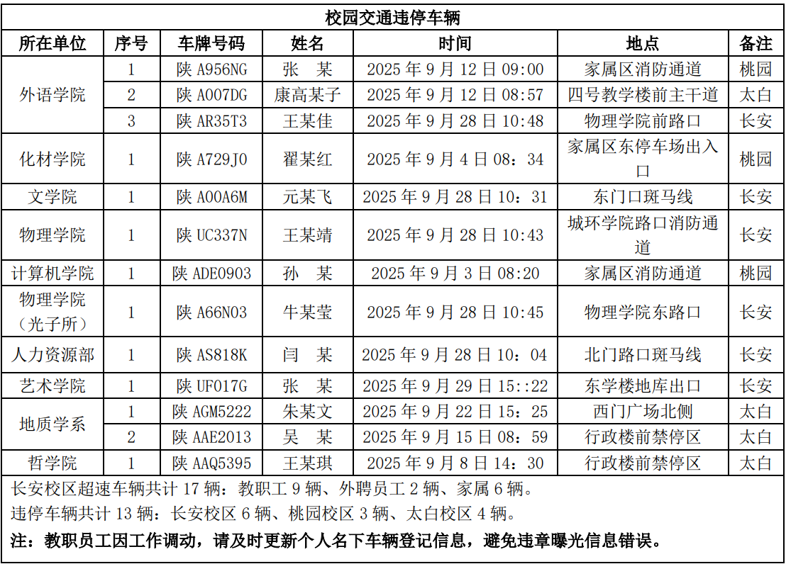 为进一步加强校园交通管理,保障校园交通安全有序,维护学校正常的教学、科研和生活秩序,切实保护师生员工的人身财产安全,根据《乐动网页版登录入口校园交通安全管理规定》的相关要求,现将2025年9月校园交通违章车辆予以曝光,具体要求与违章信息如下: