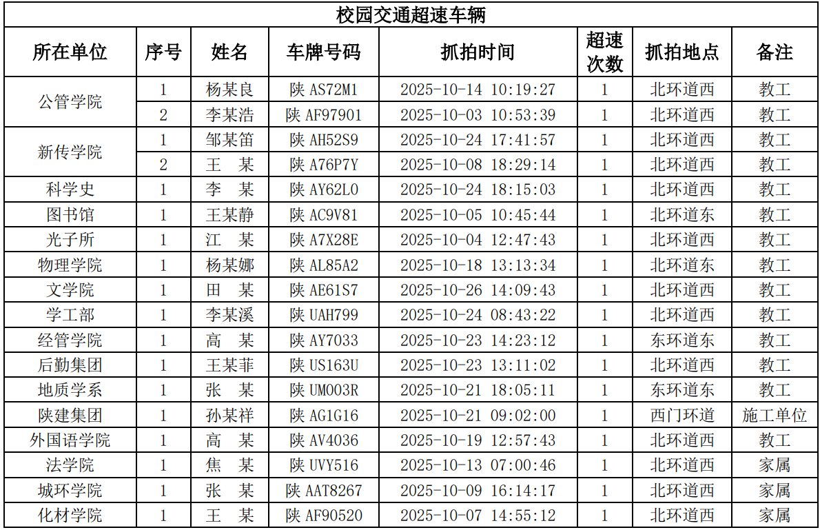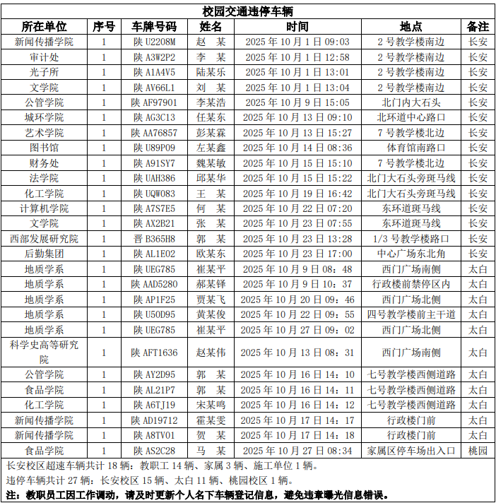 为进一步加强校园交通管理,保障校园交通安全有序,维护学校正常的教学、科研和生活秩序,切实保护师生员工的人身财产安全,根据《乐动网页版登录入口校园交通安全管理规定》的相关要求,现将2025年10月校园交通违章车辆予以曝光,具体要求与违章信息如下: