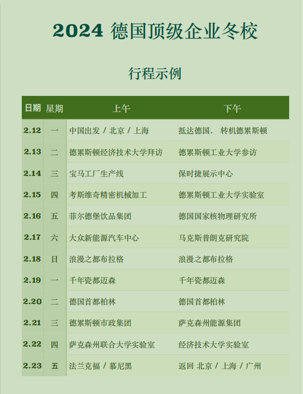 为提升学生全球竞争力,我校将在“学生海外访学计划”的框架下开展系列国际交流项目,引导学生积极参与境外高水平大学线上线下课程学习与科学研究,今年将继续推荐优秀学生参加“2024年德国顶级企业冬校项目”,现将具体信息通知如下: