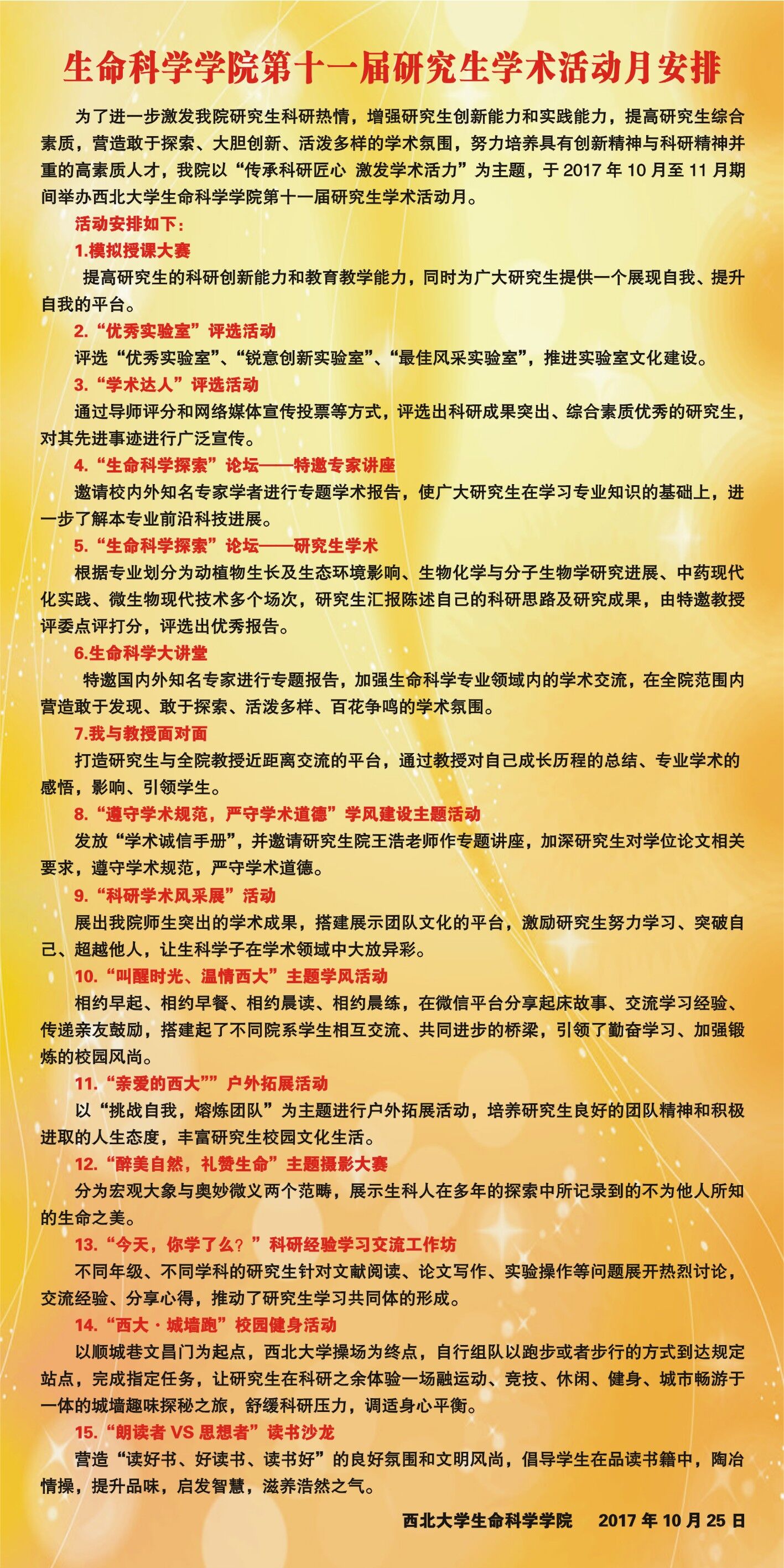生命科学学院第十一届研究生学术活动月安排