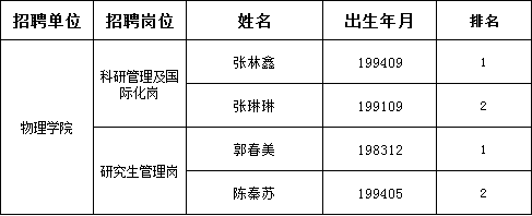 物理学院公开招聘B类人事代理人员结果公示 作者: 编辑: 时间:2019-06-13 09:18 根据《乐动网页版登录入口物理学院公开招聘管理人员公告》的工作安排,经自主报名、资格审核、初试和复试环节,现将拟录用人员名单公示如下:公示时间:2019年6月13日至2019年6月15日。公示期内,如有异议,请以书面形式向乐动网页版登录入口物理学院反映。联系电话:88303384。物理学院2019年6月13日