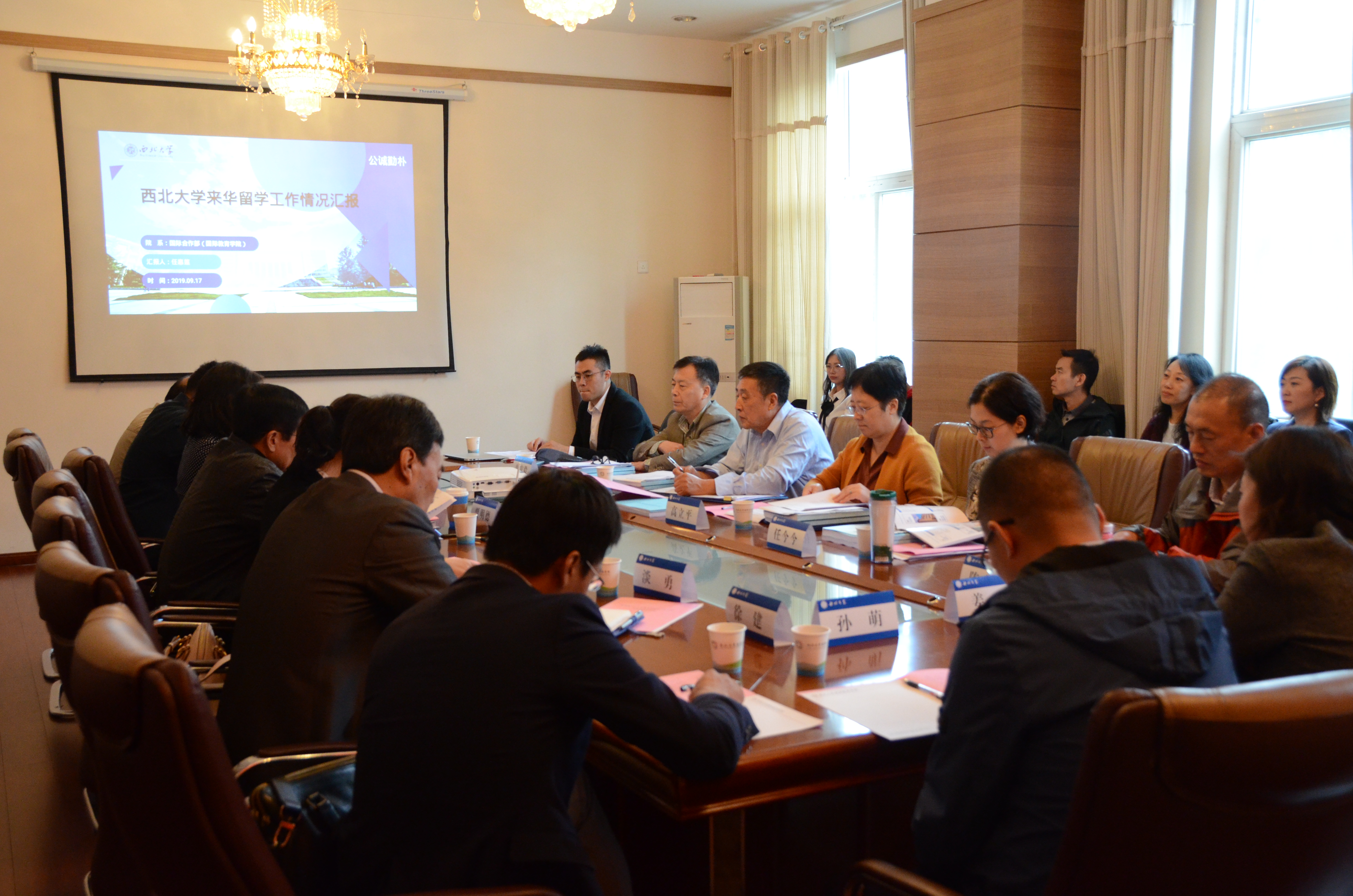 9月17日下午,细雨初歇,日展云稍。教育部来华留学工作专项调研专家组成员高立平、郭凤林、任今今一行三人来我校开展专项工作调研,陕西省教育厅对外合作与交流处副处长郭宏毅一同调研。