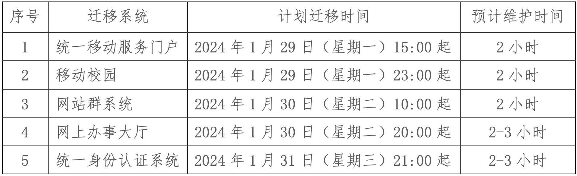 关于网站群、网上办事大厅等系统迁移维护的通知 作者:信息化处(网络和数据中心) 编辑: 时间:2024-01-29 中心将于2024年1月29日(星期一)至1月31日(星期三)对学校网站群等系统进行迁移维护工作,具体迁移时间安排见下表。迁移维护期间各系统将暂停服务,敬请谅解。我们将尽最大努力缩短维护时间,并确保迁移工作的顺利进行。待迁移完成后,系统将恢复正常运行状态,为广大用户提供更加优质的服务。 如若在维护后出现访问异常或系统故障,请广大用户及时联系信息化服务中心,电话:88301234。感谢您的理解与支持! 网络和数据中心 2024年1月29日