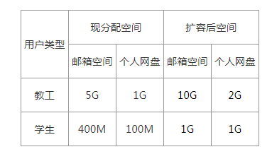 校园网邮箱服务是我校信息化建设的重要应用,也是我校师生的重要通讯平台。为了更好的满足我校师生在教学、办公、科研和学习中对邮箱服务和文档存储的需求,提供更好的服务,现代教育技术中心对校园网邮箱存储空间进行了扩容,具体空间分配情况如下: