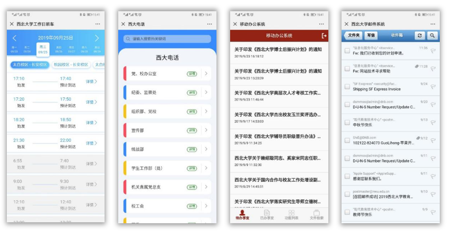 2.方便查询办公电话、学校校历、校际班车信息,手机端完成收发邮件、OA办公处理等。