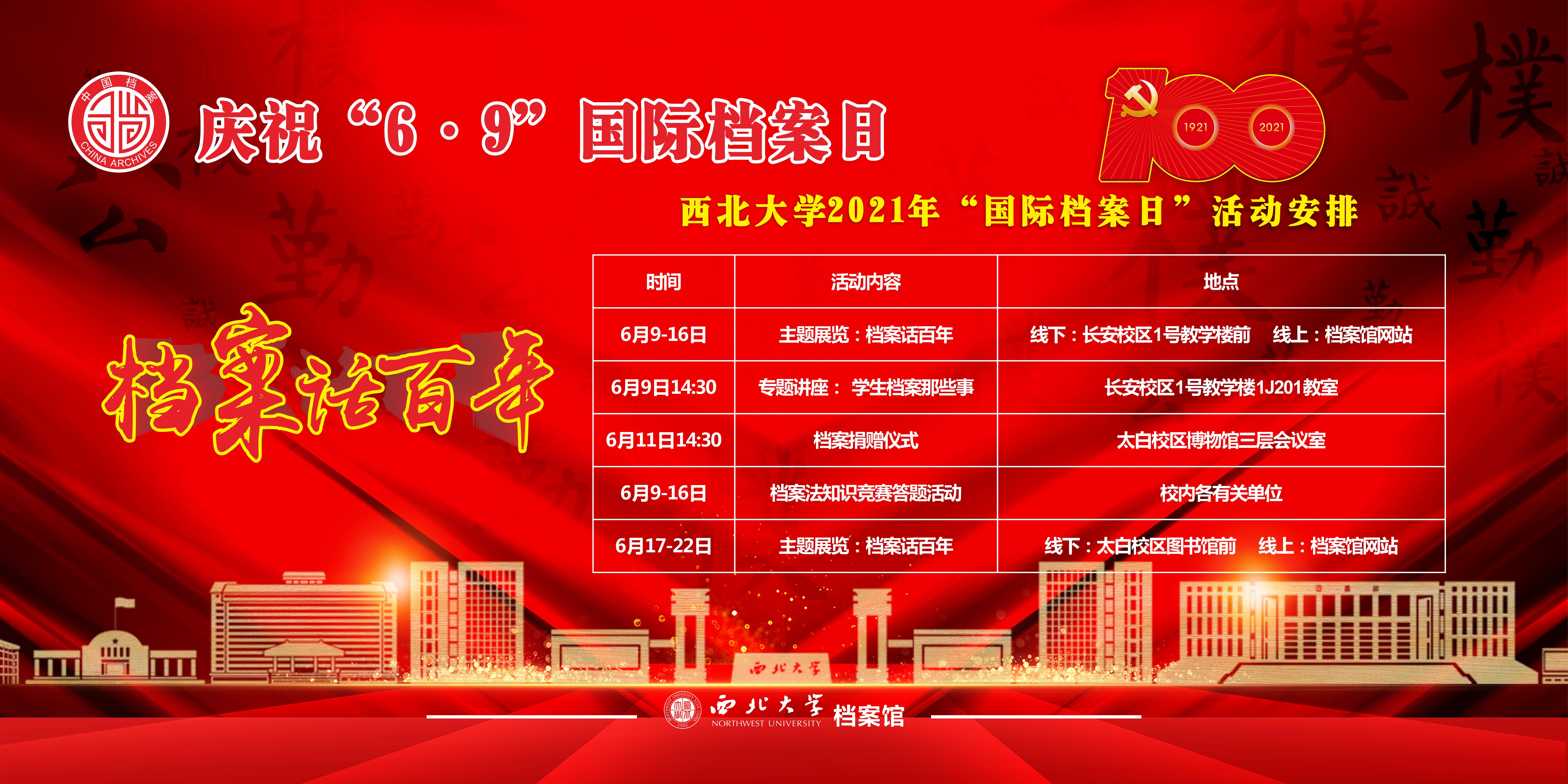 乐动网页版登录入口2021年国际档案日活动安排 作者: 编辑:孙可佳 时间:2021-06-08 为庆祝中国共产党成立100周年,宣传贯彻落实新修订的《中华人民共和国档案法》,不断增强全校师生档案意识,助力学校“双一流”建设,积极发挥档案工作“记载历史、传承文明、服务未来”的作用和档案“存凭、留史、资政、育人”的功能,讲好“西大故事”,根据国家档案局《2021年全国档案宣传工作要点》等有关精神,学校举办第七届以“档案话百年”为主题的国际档案日系列宣传活动。具体活动安排如下,欢迎广大师生踊跃参加!