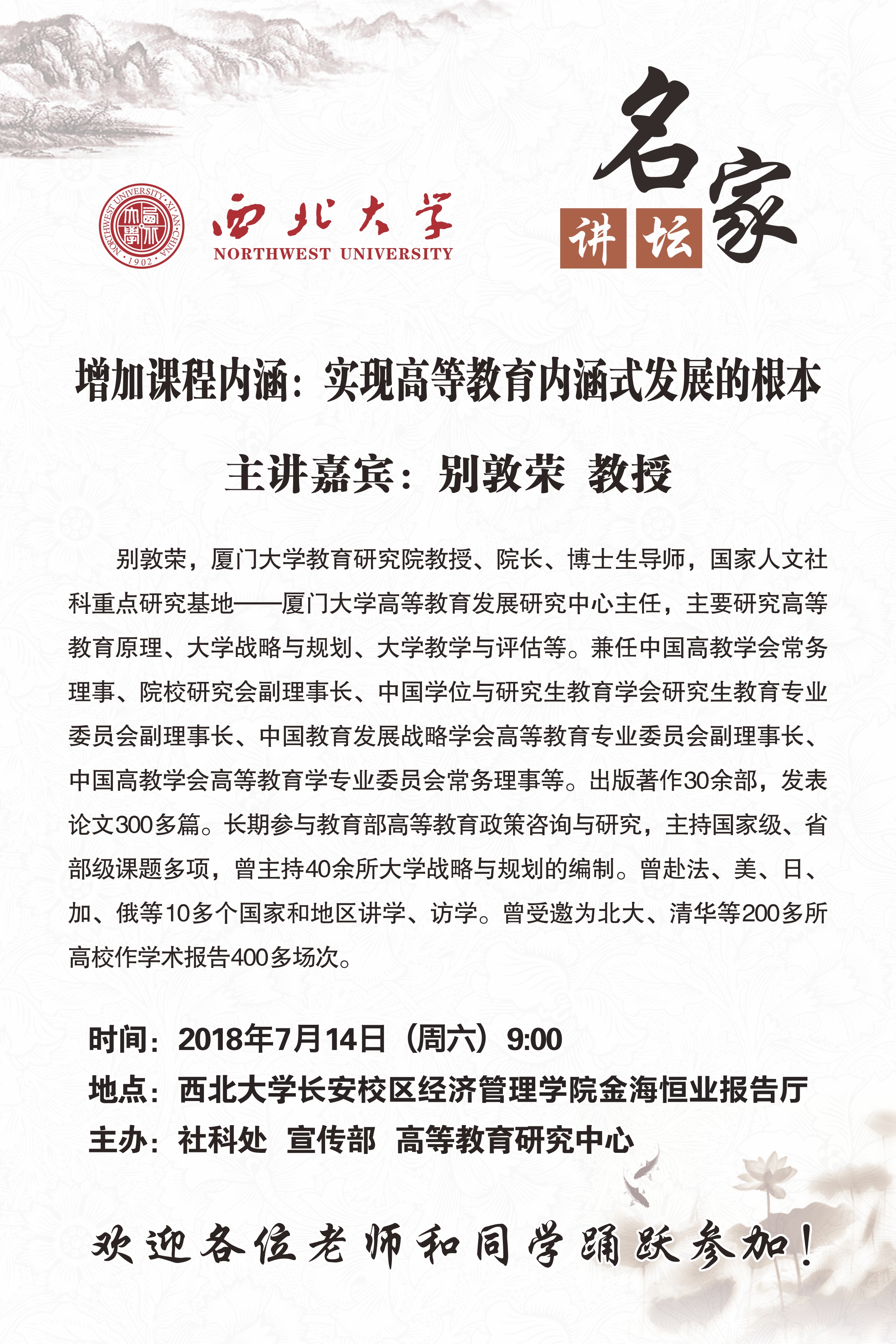 关于举办"名家讲坛"暨"高等教育论坛"(第十三期)的通知 作者: 编辑: 时间:2018-07-09 08:48 校内各有关单位:乐动网页版登录入口名家讲坛暨高等教育论坛(第十三期)即将举行,现将具体情况通知如下:讲座题目:增加课程内容:实现高等教育内涵式发展的根本主讲嘉宾:别敦荣 教授讲座时间:7月14日(周六)9:00讲座地点:乐动网页版登录入口长安校区经济管理学院金海恒业报告厅主办单位:社科处、宣传部、高等教育研究中心欢迎各位老师和同学踊跃参加!