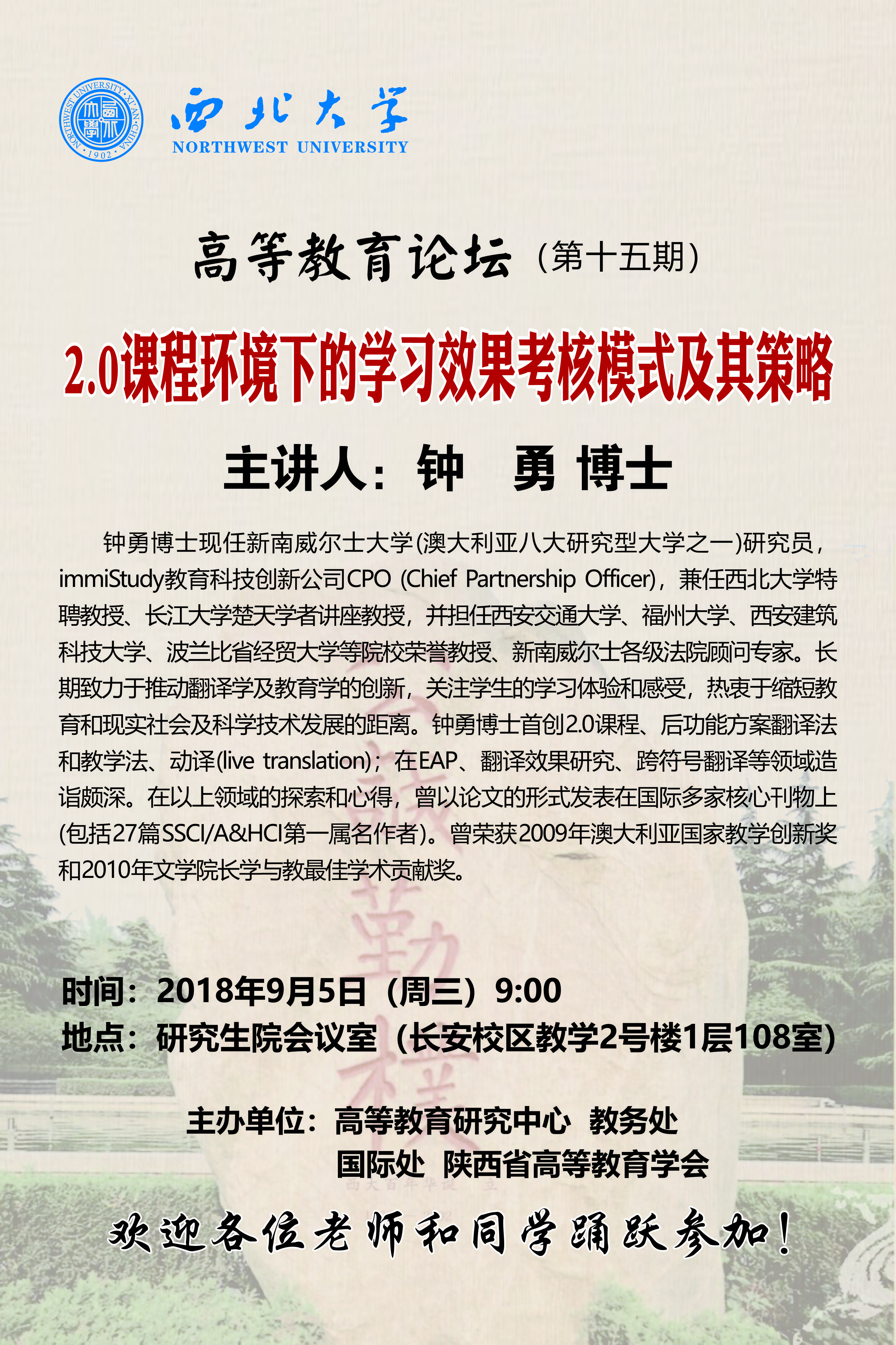 乐动网页版登录入口"高等教育论坛"(第十五期) 作者: 编辑: 时间:2018-09-03 16:59 校内各有关单位: “高等教育论坛”第十五期即将举行,现将具体情况通知如下: 讲座题目:2.0课程环境下的学习效果考核模式及其策略主讲嘉宾:钟 勇 博士讲座时间:2018年9月5日(周三)上午9:00讲座地点:研究生院会议室(长安校区教学2号楼1层108室)主办单位:高等教育研究中心、教务处、国际处、陕西省高等教育学会欢迎各位老师和同学踊跃参加!窗体顶端联系人:伍小东 13891830894
