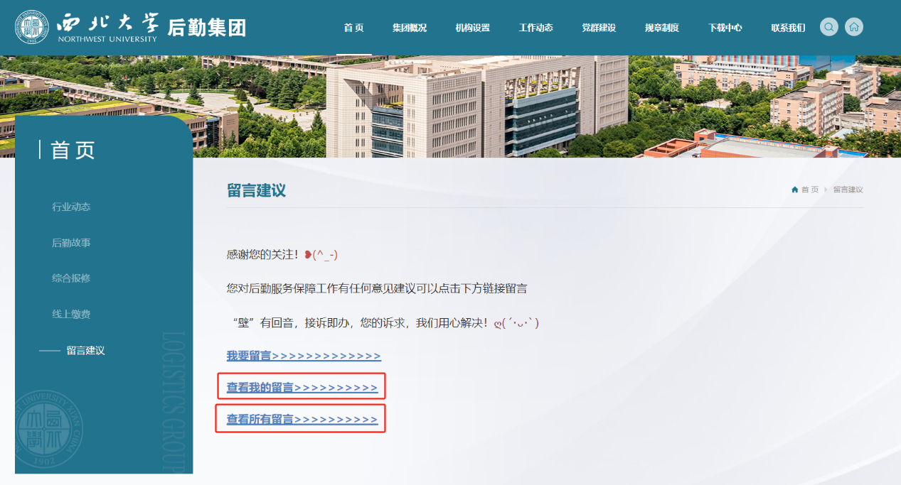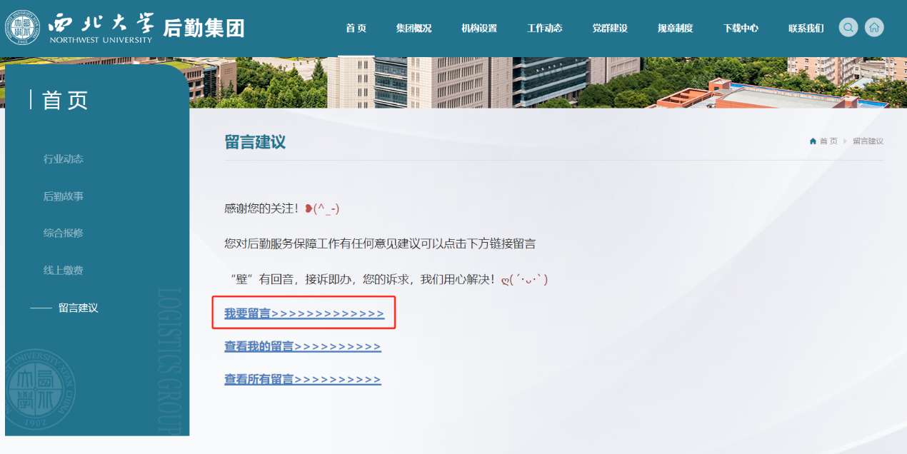 2.进入后勤集团网站乐动(中国)后,点击右上角“后勤服务回音壁”;