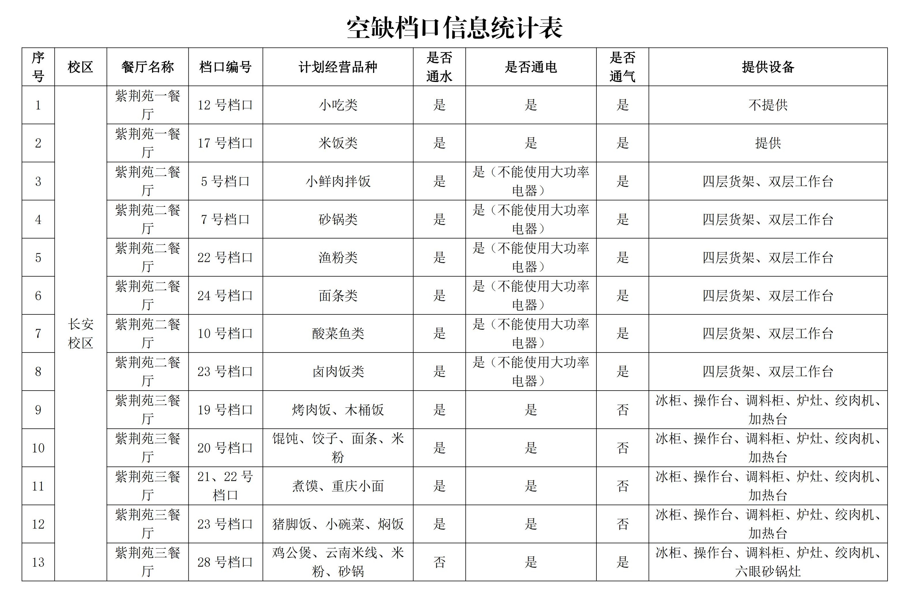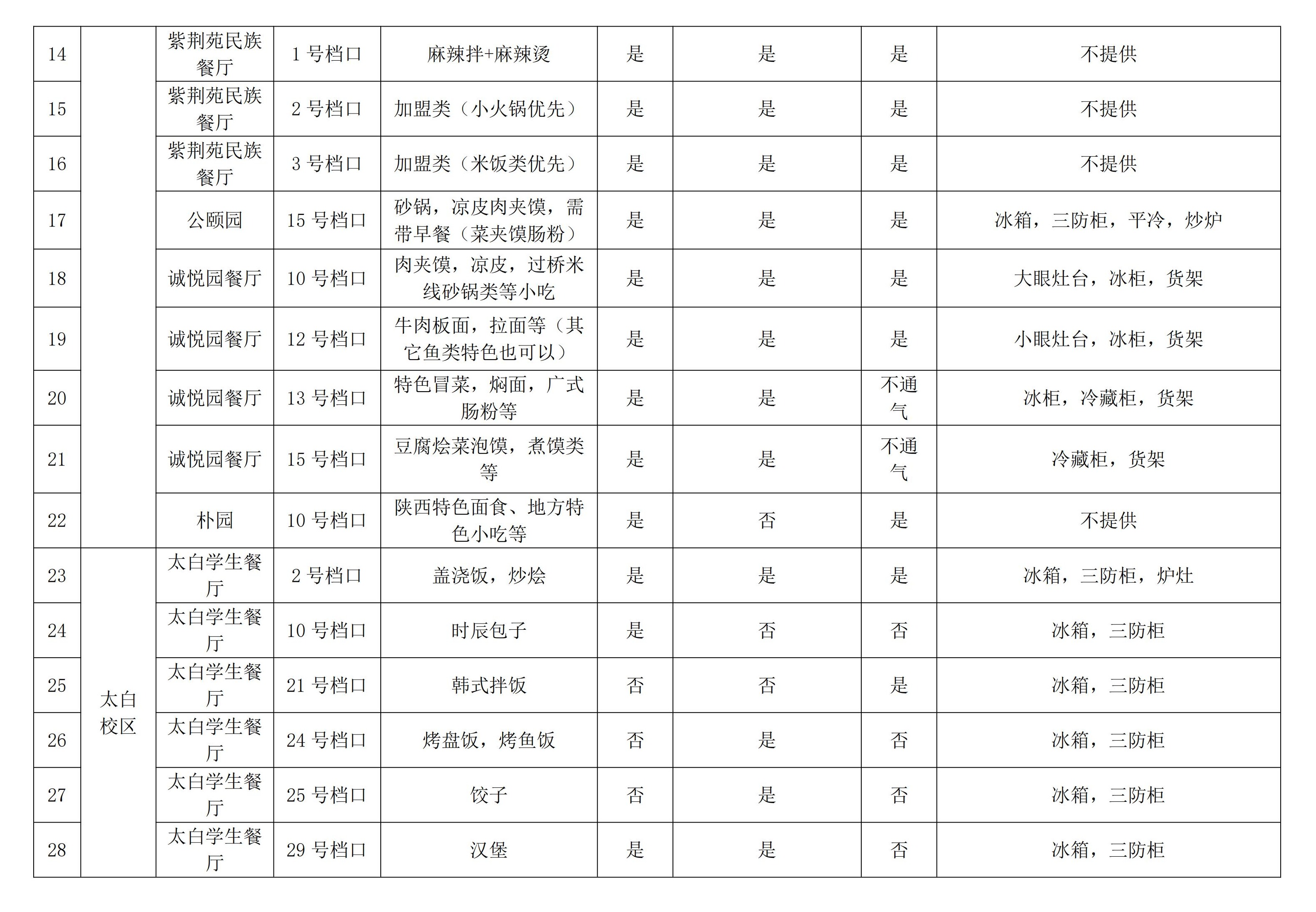 项目简介:结合各餐厅实际情况,本次共引进28个档口,部分提供设备,相关信息详见下表。