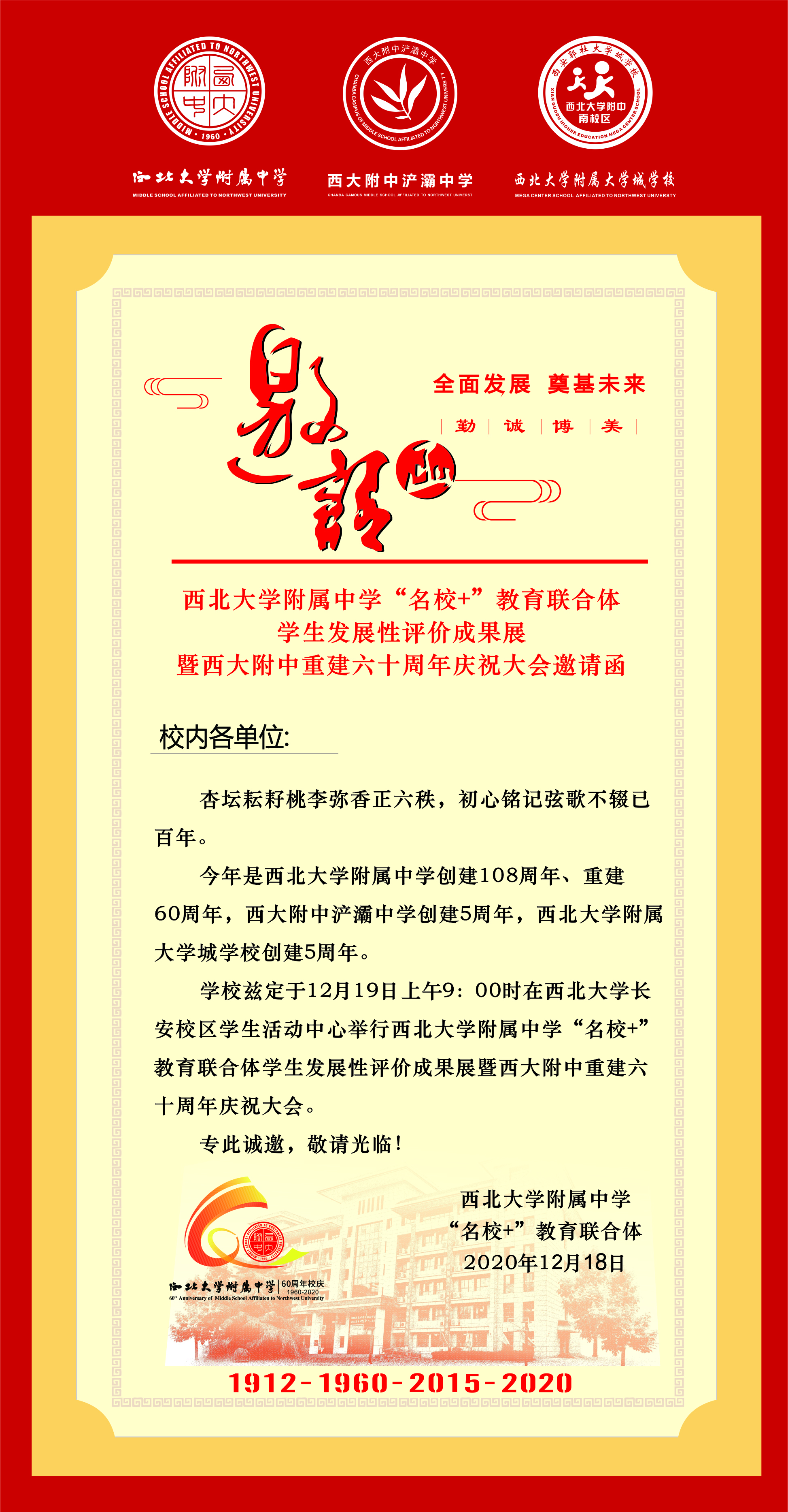 乐动网页版登录入口附属中学“名校+”教育联合体学生发展性评价成果展暨西大附中重建60周年庆祝大会公告