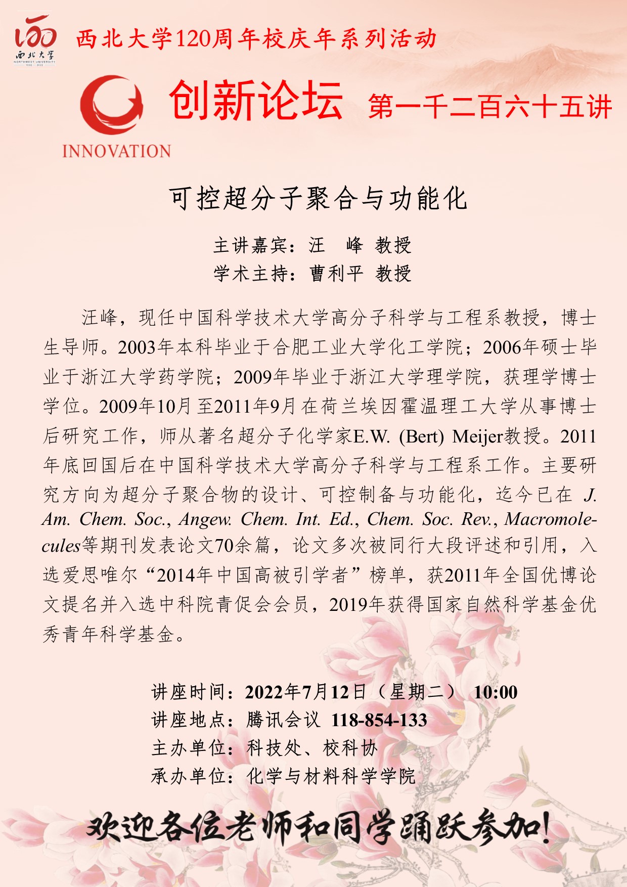 乐动网页版登录入口创新论坛第一千二百六十五讲暨120周年校庆年系列活动:可控超分子聚合与功能化