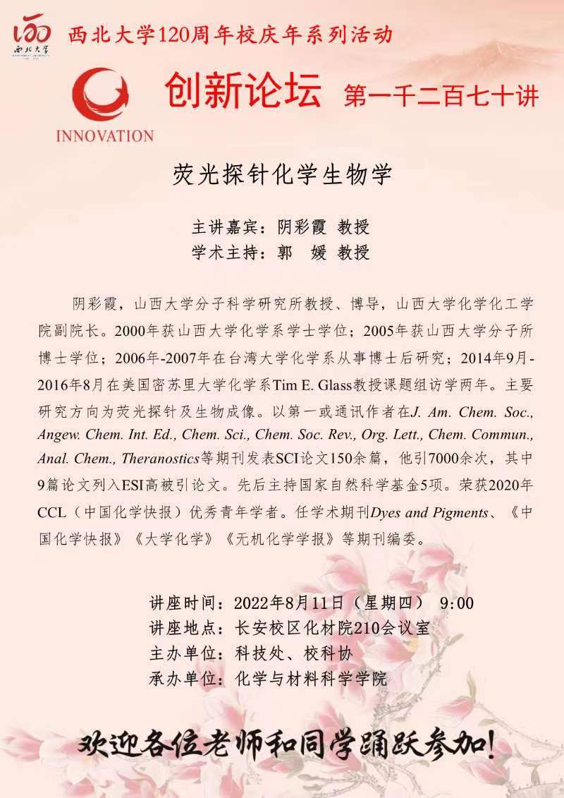 乐动网页版登录入口创新论坛第一千二百七十讲暨120周年校庆年系列活动:荧光探针化学生物学