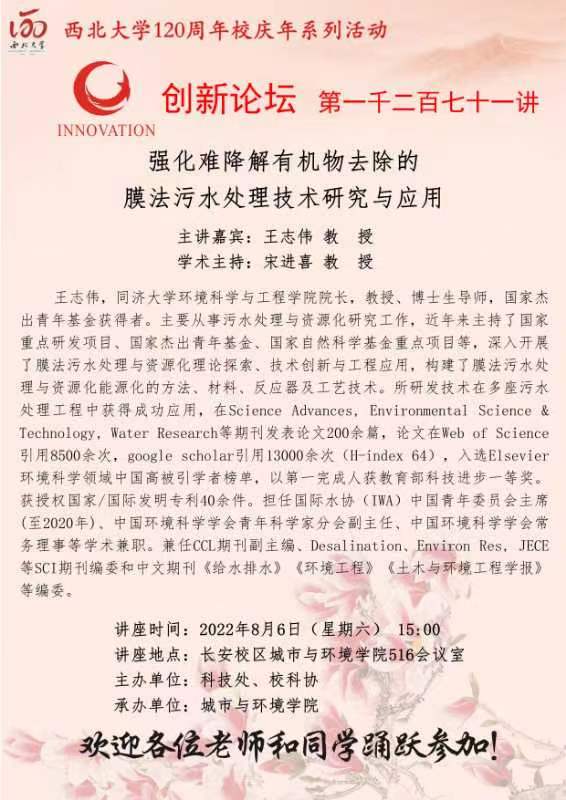 乐动网页版登录入口创新论坛第一千二百七十一讲暨120周年校庆年系列活动:强化难降解有机物去除的膜法污水处理技术研究与应用