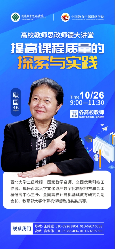 为学习贯彻落实党的二十大精神,以正确的政治方向和价值导向引领广大教师思想政治素质、师德素养和业务能力全面提升,国家教育行政学院中国教育干部网络学院将举办高校教师思政师德大讲堂,邀请我校耿国华教授作题为《提高课程质量的探索与实践》的报告,欢迎我校广大教师积极观看学习。