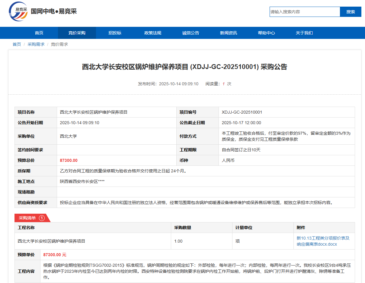 乐动网页版登录入口长安校区锅炉维护保养项目(XDJJ-GC-202510001)竞价采购公告