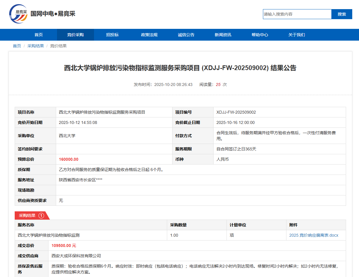 乐动网页版登录入口锅炉排放污染物指标监测服务采购项目(XDJJ-FW-202509002)竞价结果公告