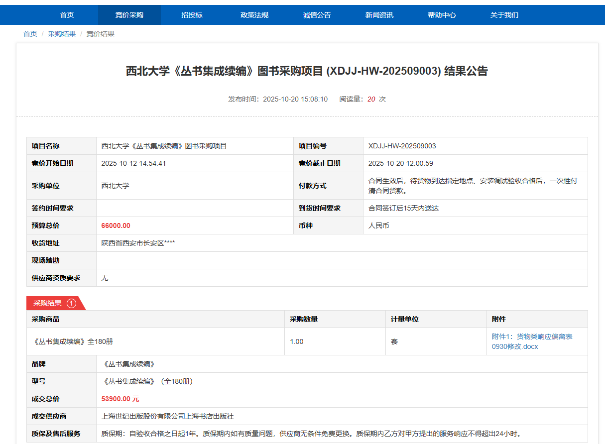 乐动网页版登录入口《丛书集成续编》图书采购项目(XDJJ-HW-202509003)竞价结果公告