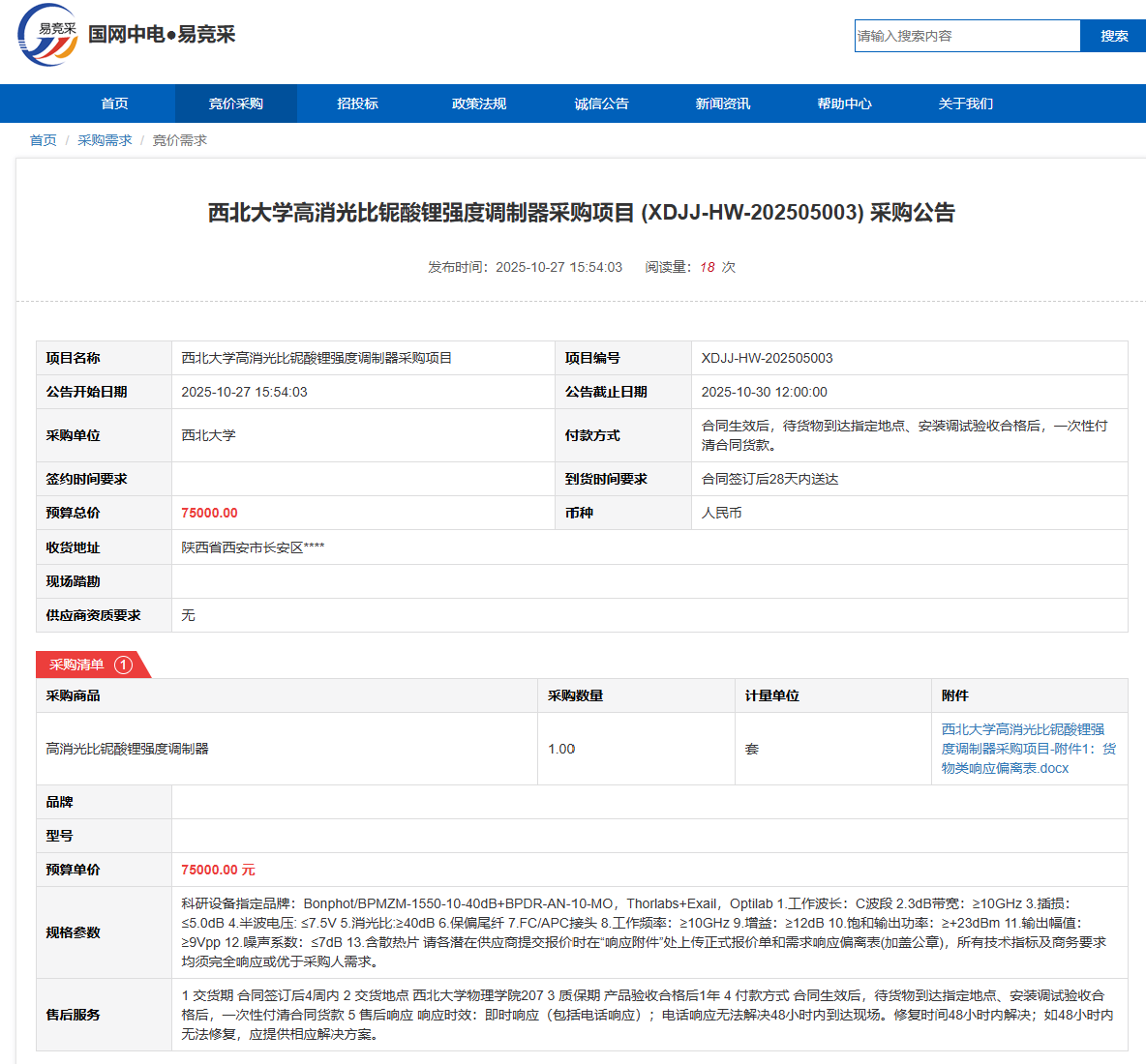 乐动网页版登录入口高消光比铌酸锂强度调制器采购项目(XDJJ-HW-202505003)竞价采购公告